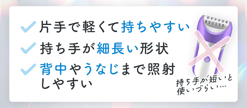 片手で持っても軽く、長い持ち手で背中までしっかり届く脱毛器を選びましょう。